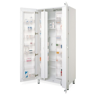 • STRUCTURE EN PLASTIQUE BILAMINÉE. • COMPARTIMENT INTERNE POUR STUPÉFIANTS • DEUX PORTES AVEC 16 COMPARTIMENTS À MÉDICAMENTS. A L’INTÉRIEUR: 2 CONTENEURS DOUBLES AVEC 32 COMPARTIMENTS ET 5 ÉTAGÈRES RÉGLABLES • PIEDS RÉGLABLES. • DIMENSIONS: MM 900x60x2000H