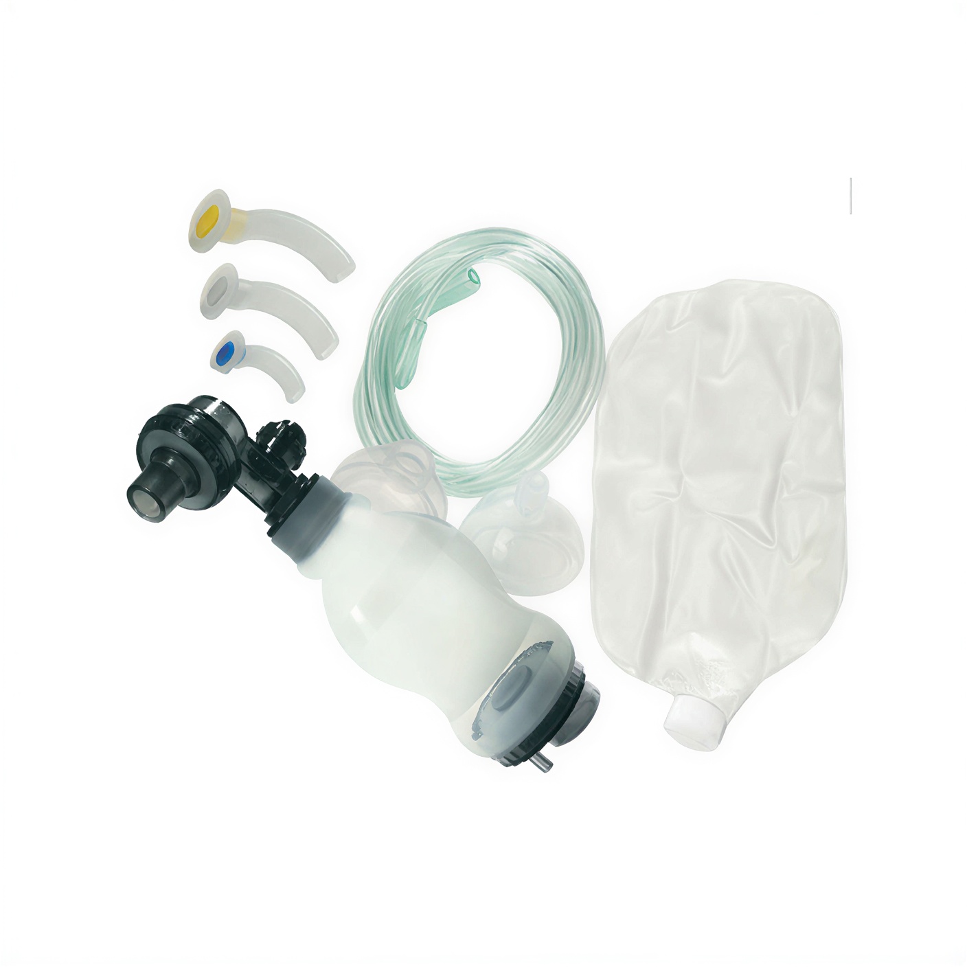 BALLON DE RÉANIMATION 280 ML AVEC UN RÉSERVOIR À OXYGÈNE DE 600 ML, ENTIÈREMENT AUTOCLAVABLE. LIVRÉ AVEC DEUX MASQUES TAILLES 0 ET 1, 3 CANULES DE GUÉDEL DE TAILLES 00/1/3 ET UN TUYAU À OXYGÈNE.