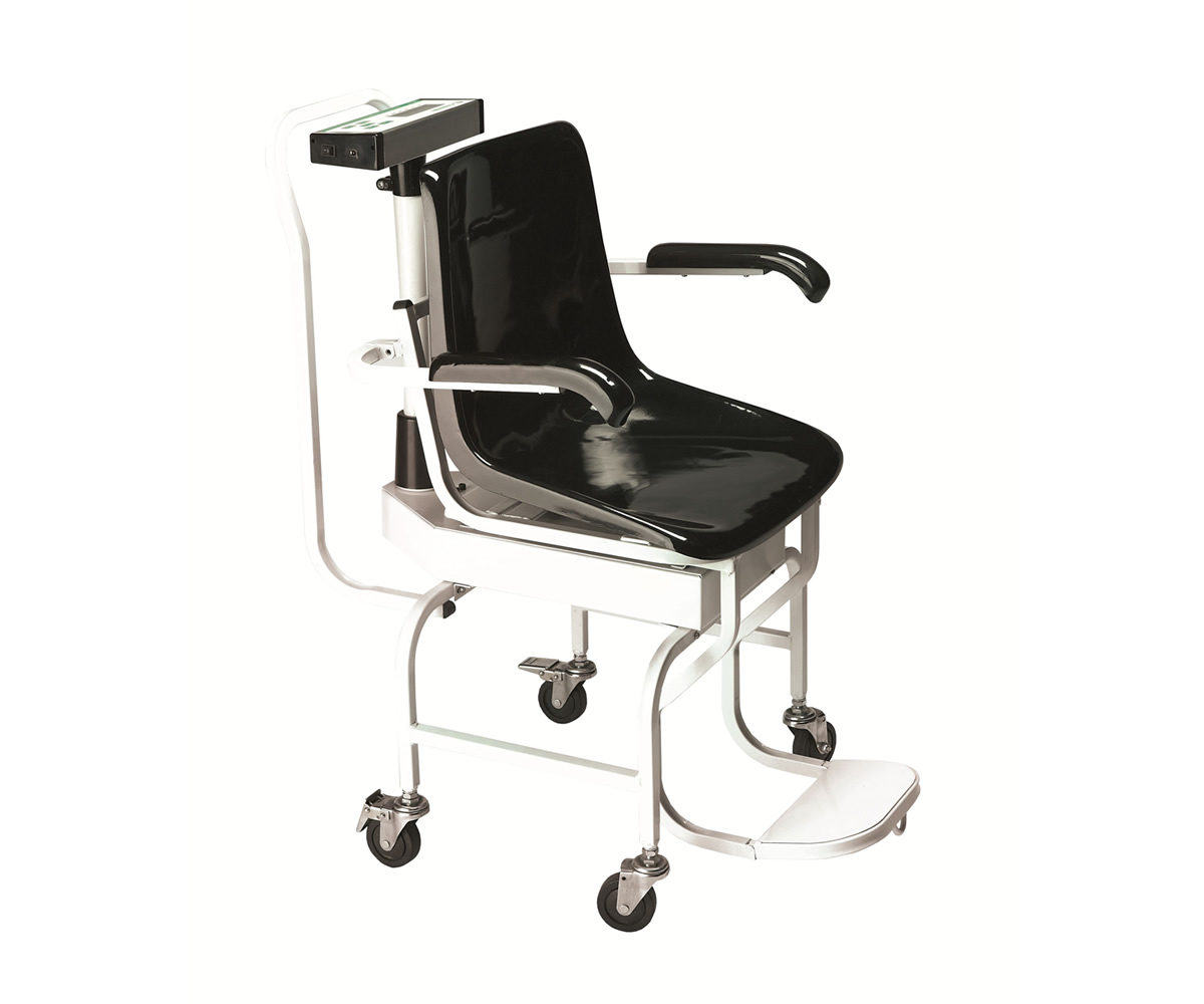 BÂTI MÉTALLIQUE, REVÊTEMENT ÉPOXY. SIÈGE EN PLASTIQUE, MONTÉ SUR 4 ROUES Ø 7 CM, 2 AVEC FREIN. PÈSE-PERSONNE DIGITAL AVEC ÉCRAN LCD. DIMENSIONS: 63 X 79 X 95 CM.