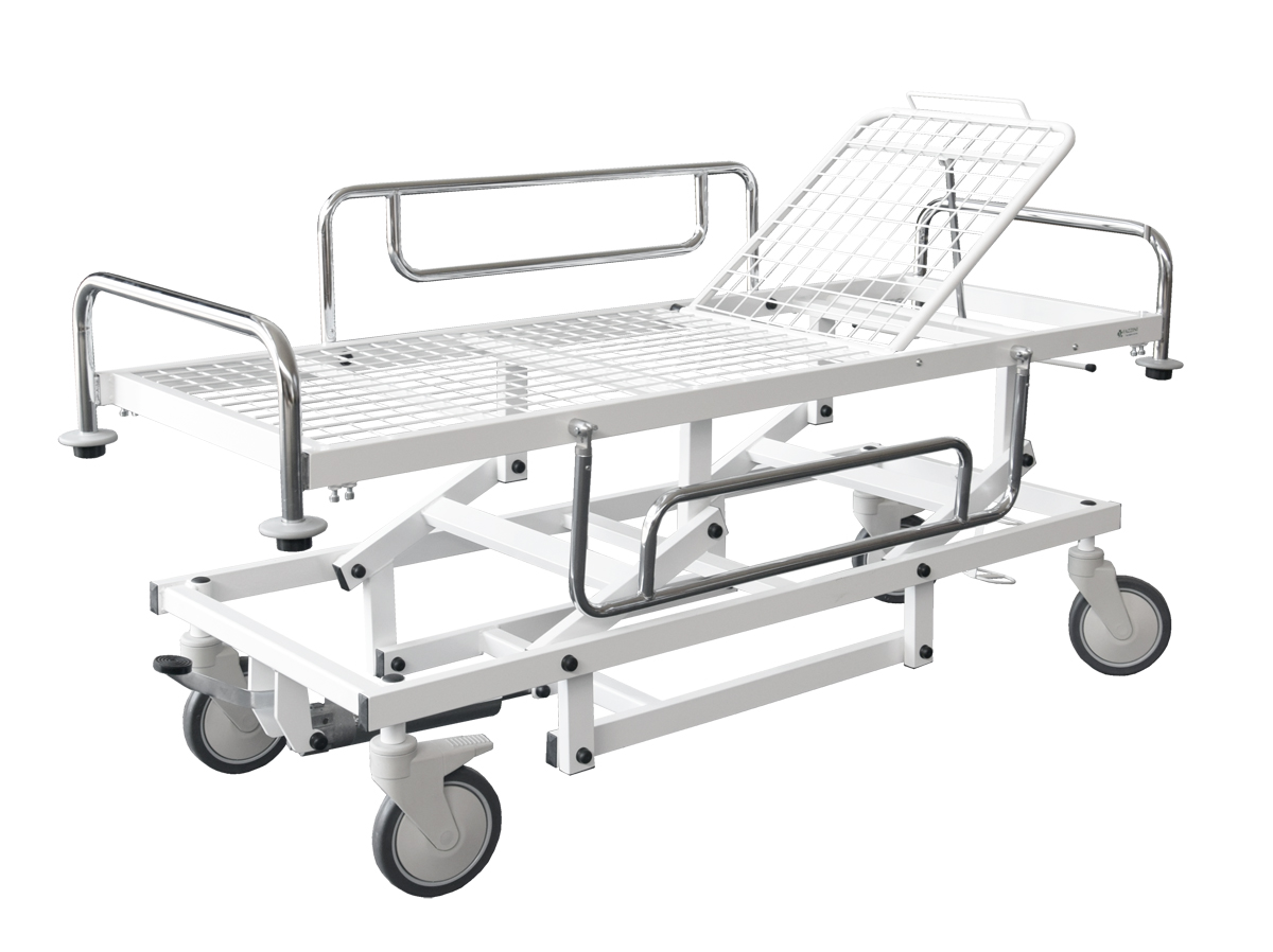 AVEC HAUTEUR VARIABLE • BÂTI MÉTALLIQUE, REVÊTEMENT ÉPOXY. SOMMIER EN TREILLIS MÉTALLIQUE RIGIDE, 2 SECTIONS. RELÈVE-BUSTE. • SOMMIER: 184,5 X 66,5 CM • HAUTEUR VARIABLE PAR VÉRIN HYDRAULIQUE, COMMANDE AU PIED. • QUATRE ROUES Ø 200 MM, DONT DEUX AVEC FREIN INDÉPENDANT. • BARRIÈRES LATÉRALES AMOVIBLES, TIGE PORTE-SÉRUM, PORTE-BOUTEILLE D’OXYGÈNE • DIMENSIONS: 55 X 185 X 55/83CM. CAPACITÉ:150 KG