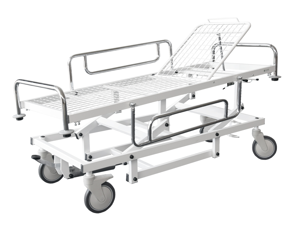AVEC HAUTEUR VARIABLE ET POSITIONS TRENDELENBURG (+7°) • BÂTI MÉTALLIQUE, REVÊTEMENT ÉPOXY. SOMMIER EN TREILLIS MÉTALLIQUE RIGIDE, 2 SECTIONS. RELÈVE-BUSTE. • SOMMIER: 184,5 X 66,5 CM • HAUTEUR VARIABLE PAR VÉRIN HYDRAULIQUE, COMMANDE AU PIED. • QUATRE ROUES Ø 200 MM, DONT DEUX AVEC FREIN INDÉPENDANT. • BARRIÈRES LATÉRALES AMOVIBLES, TIGE PORTE-SÉRUM, PORTE-BOUTEILLE D’OXYGÈNE • DIMENSIONS: 55 X 185 X 55/83CM. CAPACITÉ:150 KG