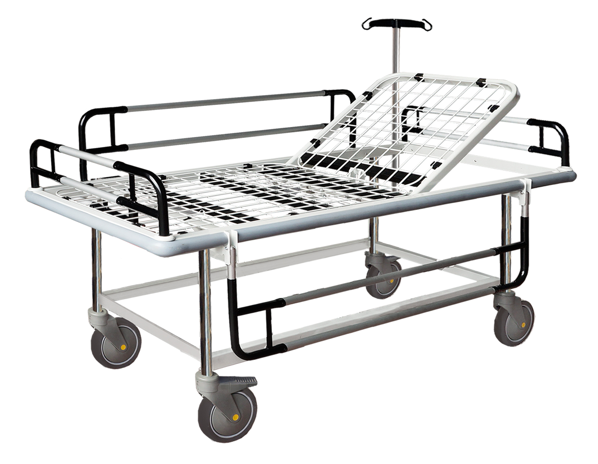 • BÂTI MÉTALLIQUE, REVÊTEMENT ÉPOXY. • SOMMIER EN TREILLIS MÉTALLIQUE RIGIDE. RELÈVE-BUSTE. • LIVRÉ AVEC TIGE PORTE-SÉRUM ET BARRIÈRES LATÉRALES. • QUATRE ROUES Ø 200 MM, DONT DEUX AVEC FREIN INDÉPENDANT. • DIMENSIONS: 75 X 198,5 X 75 CM. CAPACITÉ: 200KG