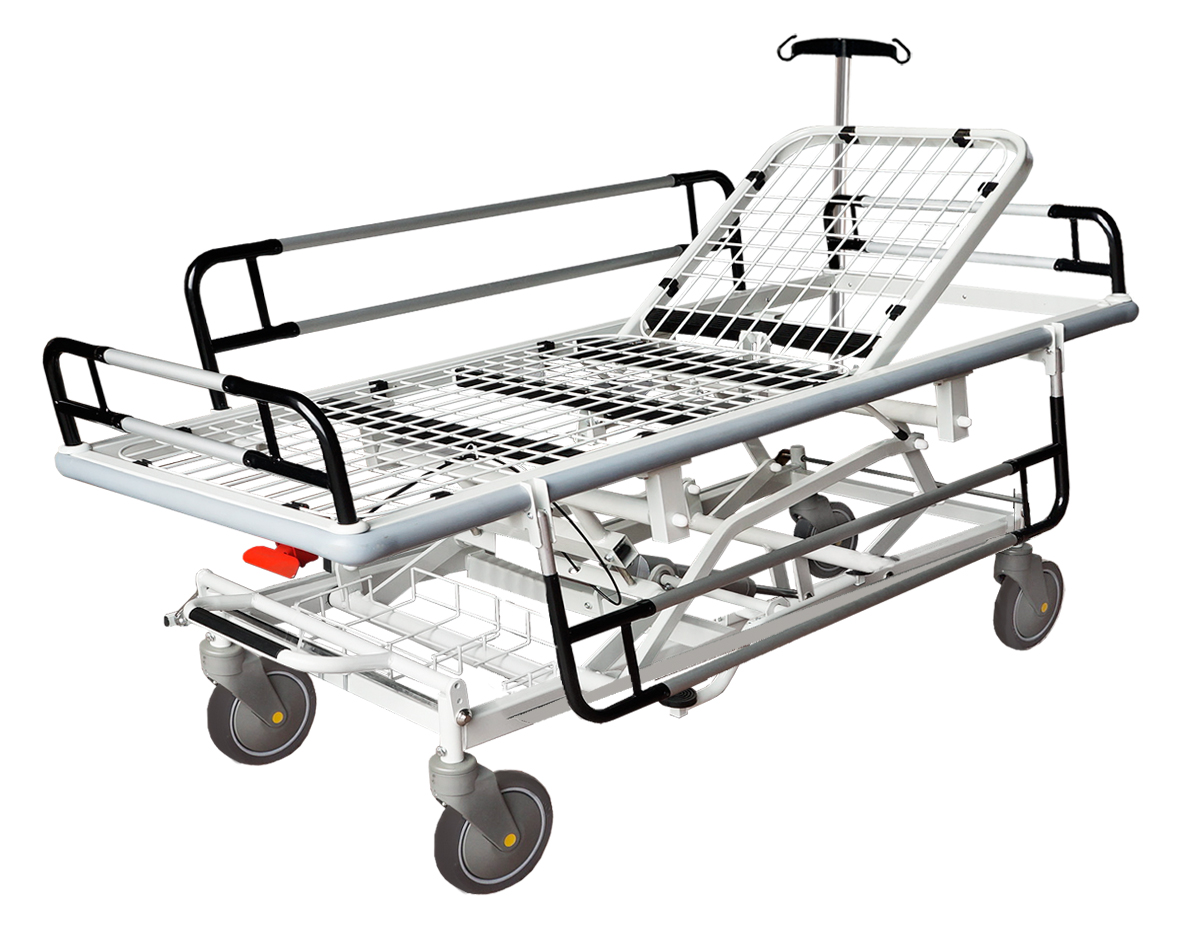 CHARIOT BRANCARD, HAUTEUR VARIABLE, AVEC TRENDELENBURG• BÂTI MÉTALLIQUE, REVÊTEMENT ÉPOXY.• SOMMIER EN TREILLIS MÉTALLIQUE RIGIDE, 2 SECTIONS.• LIVRÉ AVEC TIGE PORTE-SÉRUM ET BARRIÈRES LATÉRALES.• RELÈVE-BUSTE REGLABLE PAR POMPE A GAZ.• QUATRE ROUES Ø 200 MM, DONT DEUX AVEC FREIN INDÉPENDANT.• DIMENSIONS: 65 X 197 X 50CM• HAUTEUR VARIABLE 50/89CM. CAPACITÉ: 200KG
