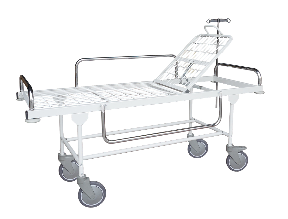 BÂTI MÉTALLIQUE ROBUSTE, REVÊTEMENT ÉPOXY. SOMMIER EN TREILLIS MÉTALLIQUE RIGIDE, 2 SECTIONS. • RELÈVE-BUSTE. • TIGE PORTE-SÉRUM ET BARRIÈRES LATÉRALES • QUATRE ROUES Ø 200 MM, DONT DEUX AVEC FREIN INDÉPENDANT. • DIMENSIONS: 72 X 200 X 70CM. CAPACITÉ: 200KG