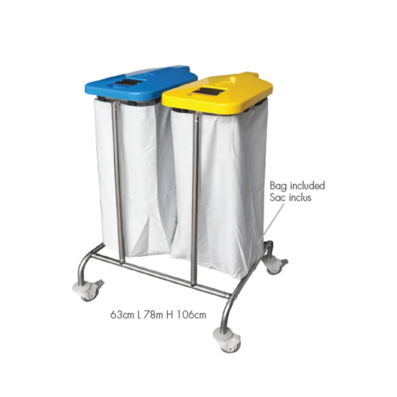 CHARIOT PORTE-SAC SIMPLE. FABRIQUÉ EN ACIER INOXYDABLE TUBE VITRÉ AISI 304 EQUIPÉ DE 4 Ø 80 MM. ROULETTES PIVOTANTES, AVEC PARE-CHOCS. SACS 100% POLYESTER, SOLIDES ET RÉSISTANTS, AVEC UNE FERMETURE EN DENTELLE PRÉ-COUSUE CHARIOT PORTE-SAC DOUBLE 63 X 78 X 106 CM