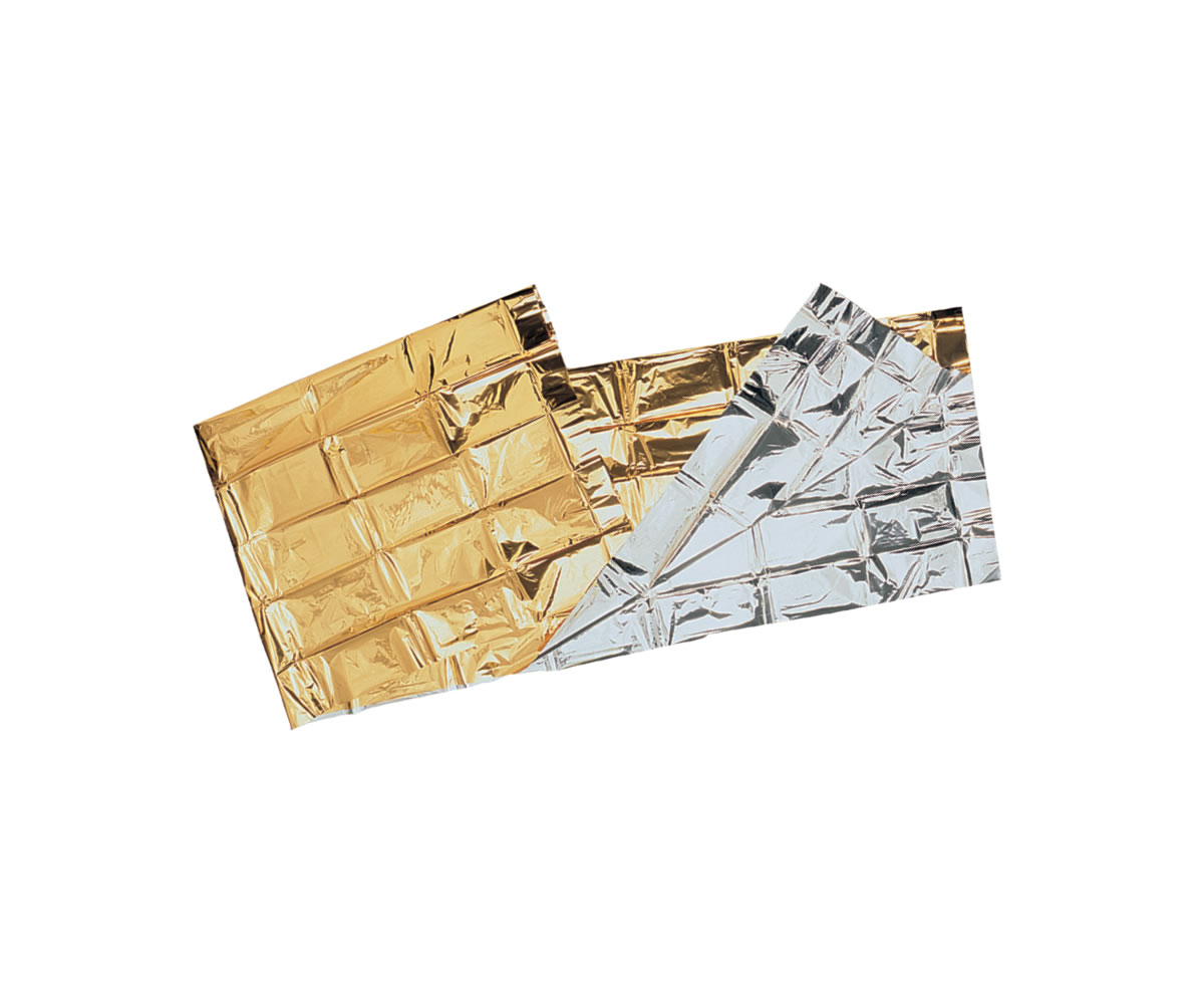 DRAP ISOLANT 2 FACES. FACE ARGENTÉE POUR LA PROTECTION CONTRE LA CHALEUR. FACE DORÉE POUR LA PROTECTION CONTRE LE FROID. DIMENSIONS: 150 X 220 CM.