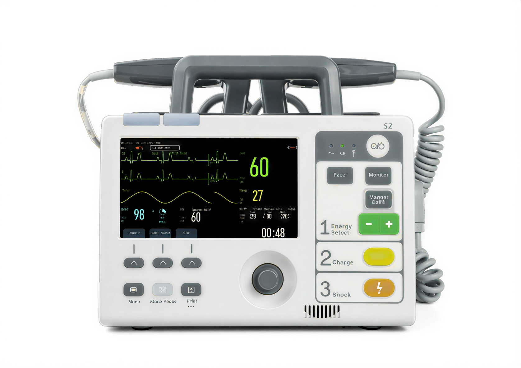 Défibrillation manuelle, ECG 3/5, surveillance ECG, écran 7 pouces,résolution 800 × 480 pixels. Batterie lithium-ion rechargeable.
