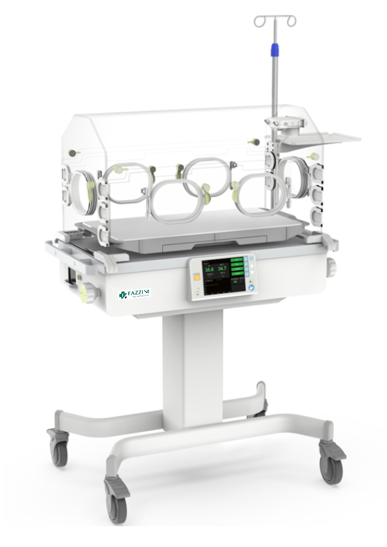 Incubateur néonatal. Écran LCD de 8 pouces. Contrôle de la température et servocommande. Contrôle de latempérature de l’air et du corps. Contrôle de l’humidité et servocommande. Matelasinclinable à ±12°. Double paroi avant et arrière et rideau d’air. Poteau IV et étagère.