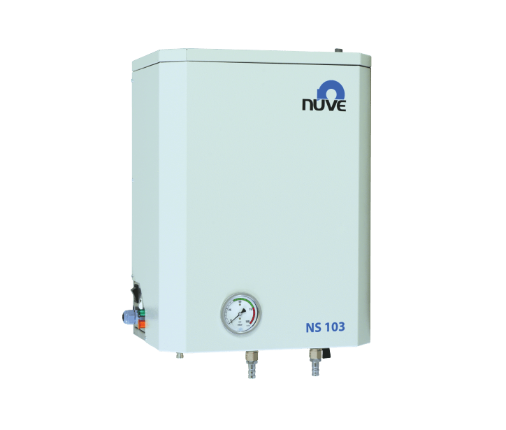 Un manomètre permet à l’utilisateur de visualiser et de contrôler la pression d’eau. Le NS 103 est conçu pour être fixé au mur et économiser l’espace du laboratoire.