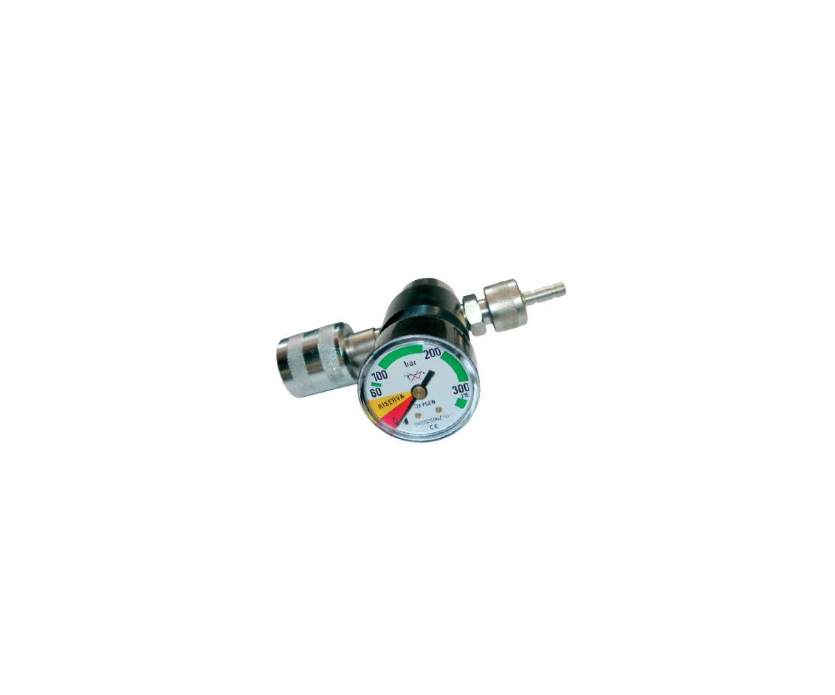 CORPS EN LAITON CHROMÉ AVEC SOUPAPE DE SÉCURITÉ. DÉBIT : 6 L/MIN. MANOMÈTRE Ø 42, ÉCHELLE 0-315 BAR. RACCORD SORTIE AVEC TUYAU 6 MM DE DIAMÈTRE. RACCORD ITALIE (UNI)