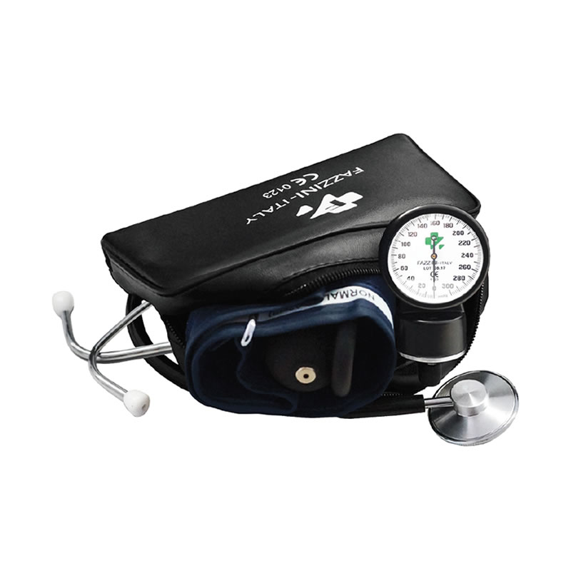• SPHYGMOMANOMÈTRE ANÉROÏDE • MANOMÈTRE EN ACIER 0-300 MMHG +/-3 MM HG. SANS BUTÉE AVEC ANNEAU METAL. BRASSARD VELCRO. LIVRÉ EN POCHETTE AVEC STÉTHOSCOPE.