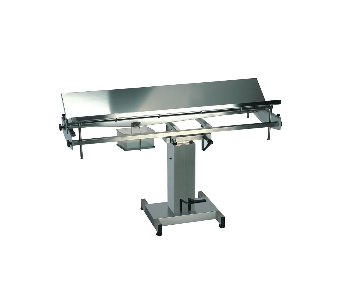 • TABLE D’OPÉRATION VÉTÉRINAIRE EN ACIER INOX AISI 304. • VÉRIN HYDRAULIQUE, COMMANDE AU PIED. • DOUBLE PLAN EN V AVEC SYSTÈME DE RÉCEPTION DES LIQUIDES EN ACIER INOX ET CUVETTE PVC AMOVIBLE. PROCLIVE/DÉCLIVE MANUELLE. • BASE AVEC PIEDS RÉGLABLES. • DIMENSIONS: 50 X 150 X 89/116CM. CAPACITÉ: 120KG