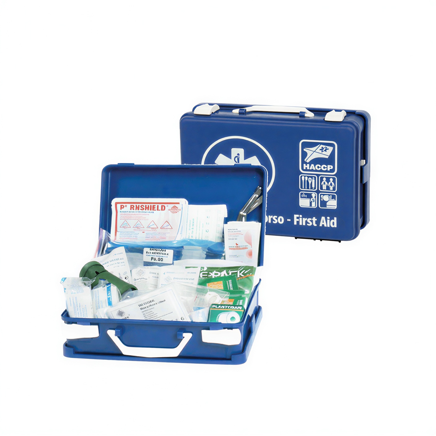 DIMENSION: 250X190X90 MM 1 BOX 100 ASSORTED BLUE DETECT. DRESSINGS 1 ADHESIVE BANDAGE BLUE 6X100 CM 1 POUCH 8 PCS ADHESIVE SUTURE 1 ROLL PLASTOSAN TNT 5M X 2,5 CM 1 TISSUE 40 X 60 DIN (FOR BURNS) 5 STERILE GAUZE 18X40 1 LISTER SCISSORS CM 14,5 3 STERILE M BANDAGE 80X100 2 STERILE G BANDAGE 100X120 1 CLOREXIDINE SPRAY 50 ML 1 LATEX THIMBLE SIZE L (BOX 10 PCS) 2 STERILE GLOVES STANDARD SIZE.